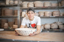 We form each slab by hand to create the distinctive bullnose contour around the rim, which is then set on a form to dry before kiln-firing. We hand dip glazes, sometimes using up to three applications.